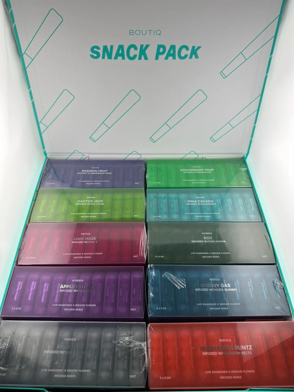 The Boutiq snack pack offers a delightful assortment of mini pre-rolls, perfect for sampling different flavors and strains. Each Boutiq snack pack provides a variety of premium cannabis experiences, allowing you to explore the range of Boutiq infused offerings. This is an ideal way to discover new favorites and enjoy a diverse selection of high-quality, live diamond infused pre-rolls.
